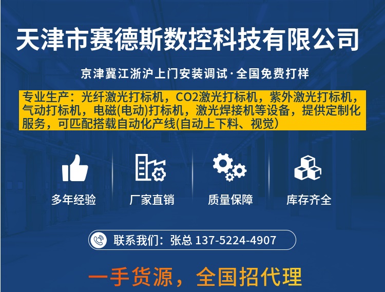 ABOUT US天津市赛德斯数控科技有限公司专业生产:光纤激光打标机,CO2激光打标机,紫外激光打标机,气动打标机,电磁(电动)打标机,激光焊接机,电动攻丝机等设备,提供定制化服务,可匹配搭载自动化产线(自动上下料、视觉)。京津冀江浙沪可上门调试安装,全国诚招代理。价格优惠,欢迎咨询。